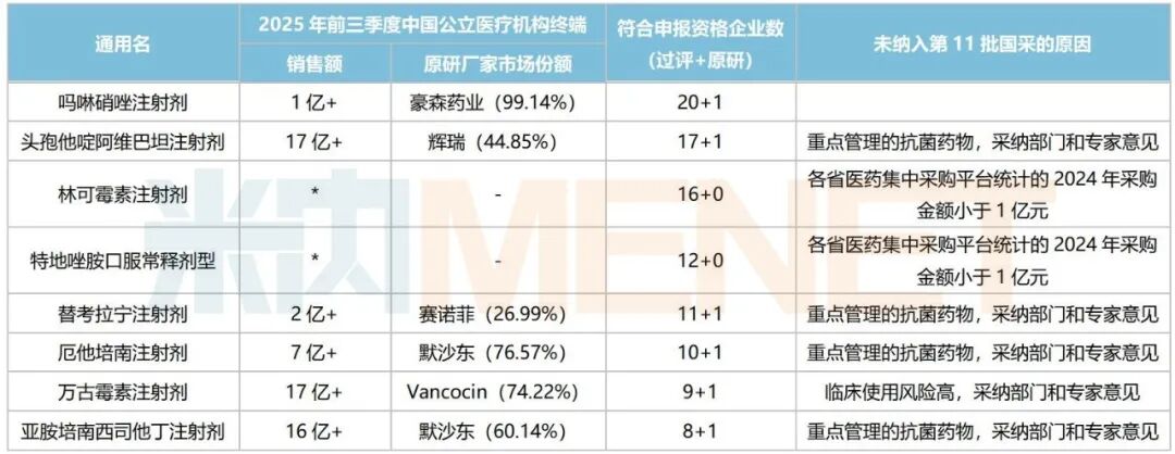 除了吗啉硝唑注射剂,其余7个品种在第十一批国采中因各种因素而未被最终纳入,包括头孢他啶阿维巴坦注射剂、万古霉素注射剂、亚胺培南西司他丁注射剂等超10亿大品种。这些品种是否会被纳入第十二批国采?我们拭目以待!