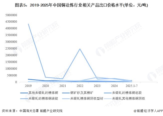 2019-2025年7月,中国铜冶炼行业相关产品平均出口价格整体有所上升,部分商品由于出口规模较小,平均出口单价波动剧烈。2019-2025年7月我国铜冶炼行业相关产品出口价格水平统计如下: