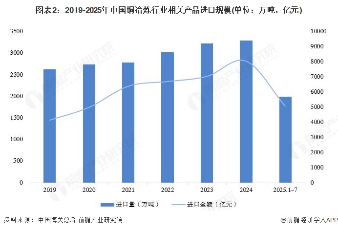 2025年1-7月,中国铜冶炼行业相关产品进口量为2000.28万吨,进口金额为5075.57亿元。
