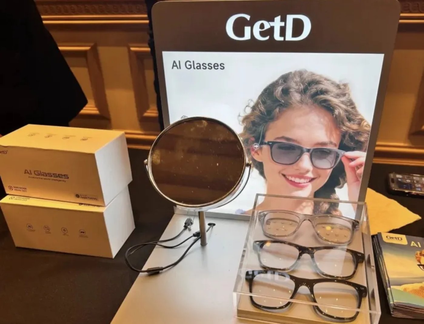 格多维GetD的AI音频眼镜主打纯音频交互,支持通过ChatGPT等进行智能对话,满足信息查询、简单翻译等日常需求。在音频基础上增加了拍摄能力,展示的型号搭载1200万像素高清摄像头,并集成健康监测、设备防丢等实用功能。