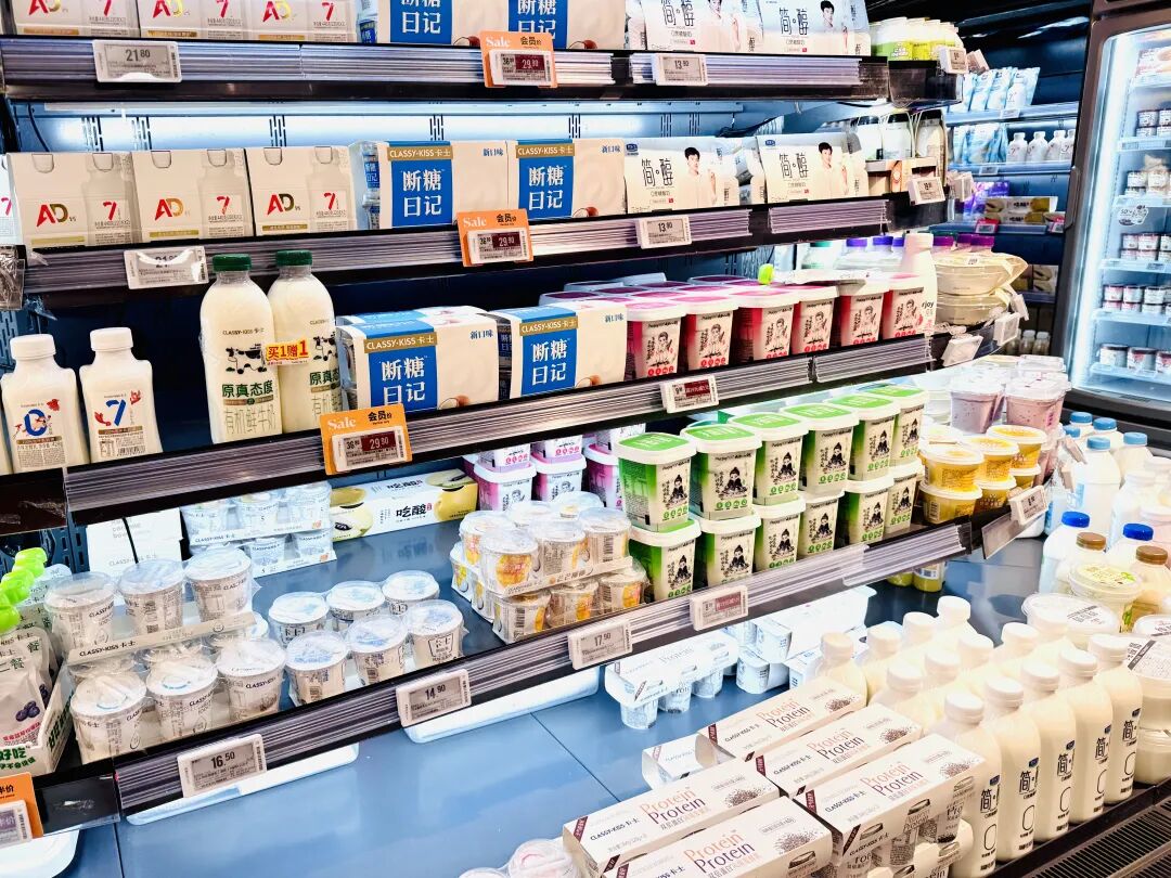 超市冷鲜柜中展示着牛奶、酸奶产品。