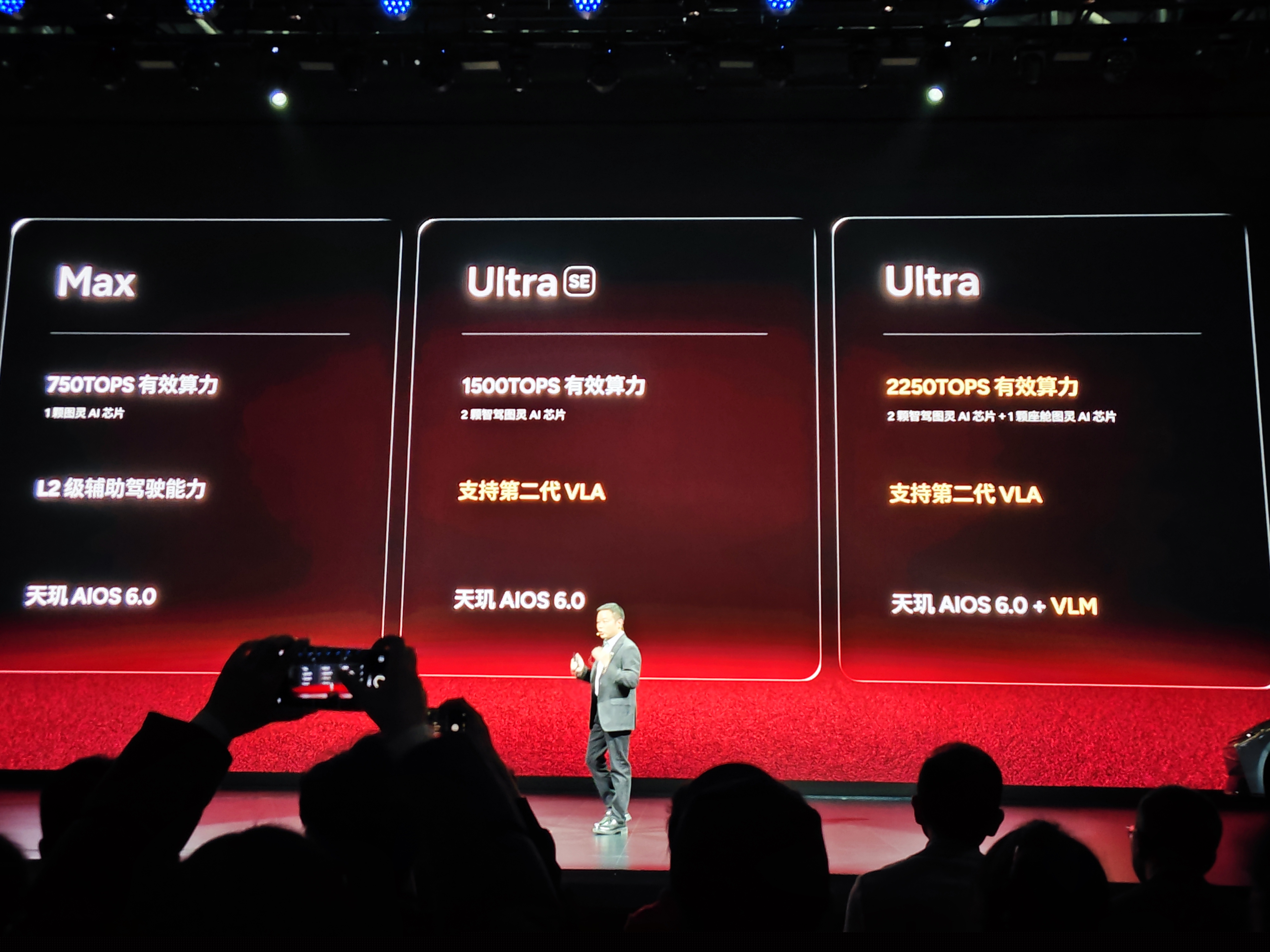 其中,Max搭载一颗图灵AI芯片,支持L2级辅助驾驶;Ultra SE版搭载2颗图灵AI芯片,Ultra版搭载3颗图灵AI芯片,均能够支持第二代VLA。