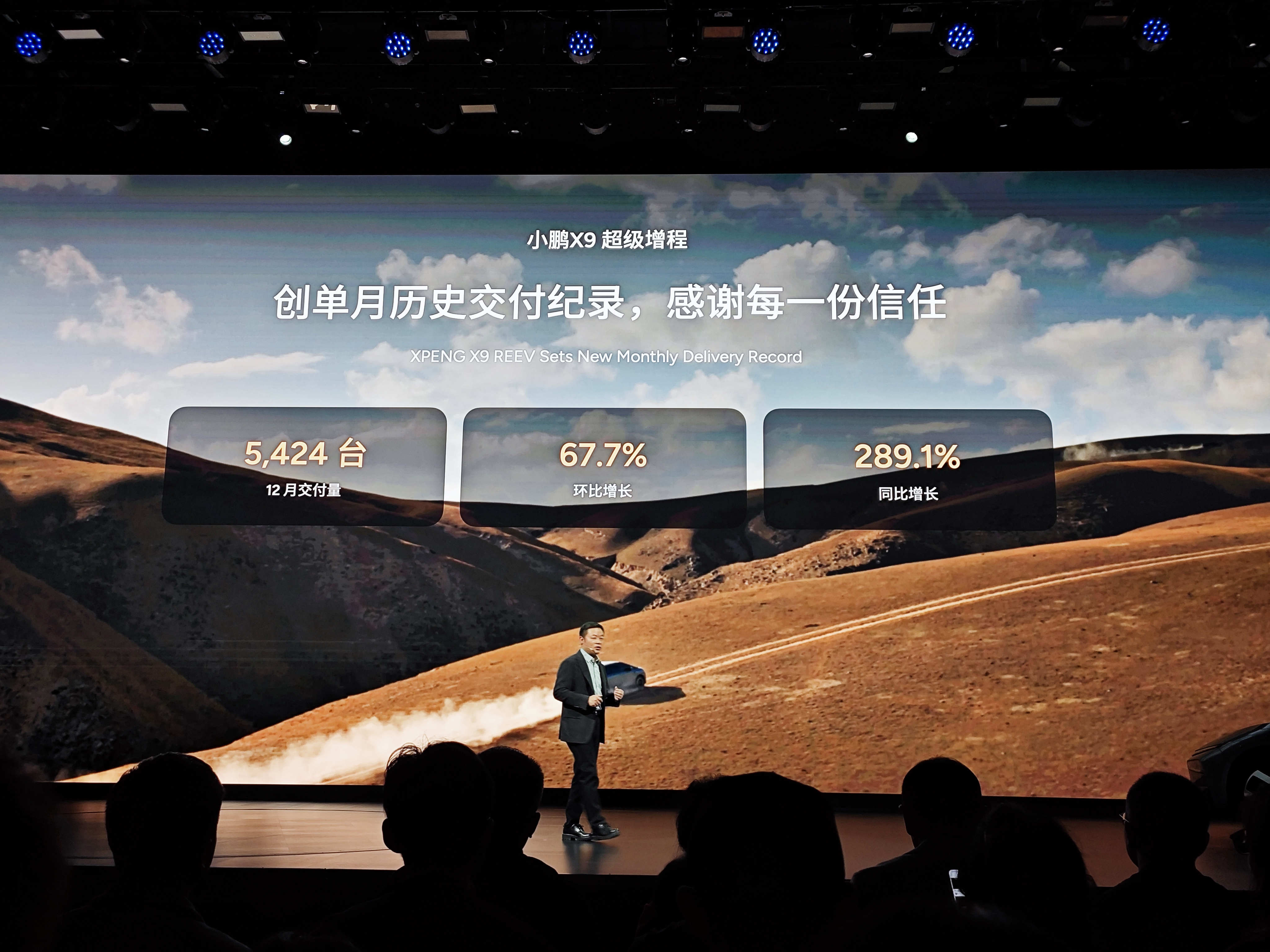 小鹏首款增程车型X9超级增程的市场成绩很出色,在发布会期间,小鹏汽车创始人何小鹏宣布,小鹏X9超级增程在12月份交付5424辆,同比增长289.1%。