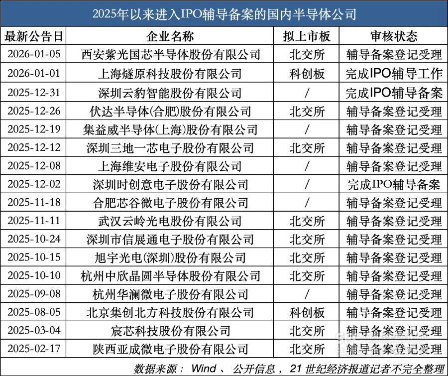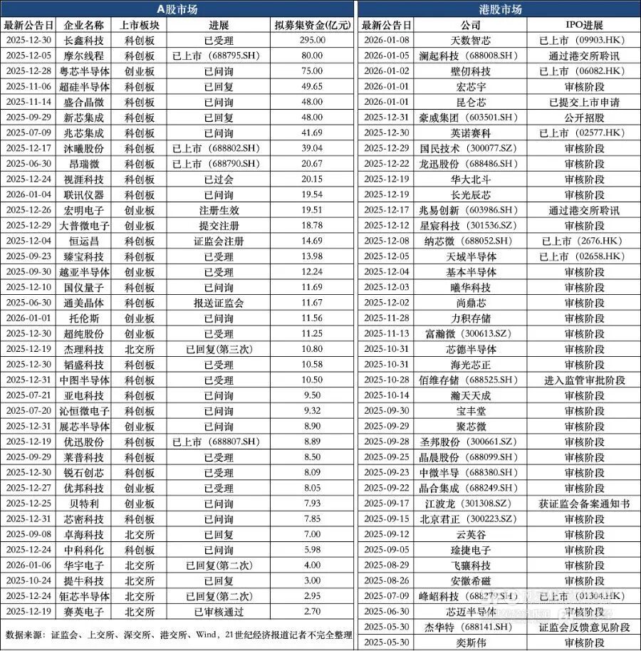 整体来看,2025年以来,半导体行业的A股IPO明显活跃,据21世纪经济报道记者不完全统计,2025年以来有38家半导体企业开启A股IPO进程,合计拟募资金额近千亿,达996.65亿元,平均单家募资额达26.23亿元。