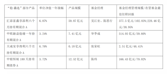 “稳·鑫选”旗下产品包括汇添富鑫享添利六个月持有期混合A、大成安享得利六个月持有期混合A、中银恒锐180天持有期债券A、中欧融益稳健一年持有期混合A,以及其他合格投资者可见的4款产品。前4款产品近一年收益在3%至7%之间,其中大成安享得利六个月持有期混合A近一年单位净值涨幅达到6.76%。