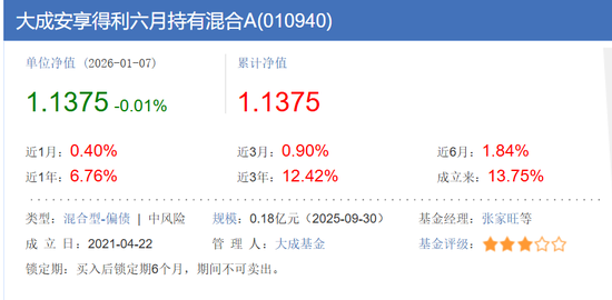 作为一款中等风险的偏债混合型基金,大成安享得利六个月持有期混合A成立于2021年4月22日,运营四年多,该基金净资产规模已经从初始的3.03亿元跌至截至2025年月末的0.18亿元,堪称“迷你基”中的“迷你基”。