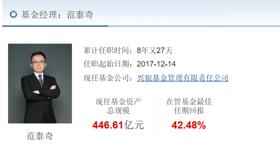 公开信息显示,范泰奇,中国国籍,博士研究生,曾任职于方正证券资产管理北京分公司、英大基金、易鑫安资管。2016年11月,范泰奇加入兴银基金,现任固定收益部副总经理、基金经理。