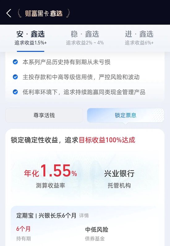 那么,业绩究竟如何呢?财报星球登录“财富黑卡鑫选”官方页面,其显示,目前,“财富黑卡鑫选”已经上线了3款产品,包括“安·鑫选”、“稳·鑫选”和“进·鑫选”。