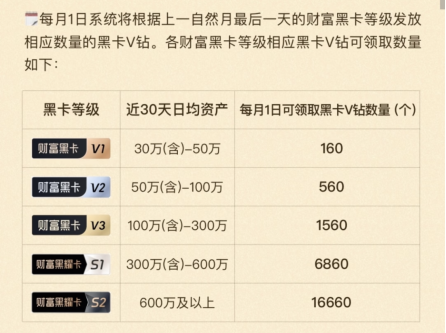 在本次权益升级之前,“财富黑卡”V3用户每月可直接领取8.8元话费红包、星巴克咖啡券、100元加油券等价值约150元的固定权益。权益升级之后,上述“财富黑卡”V3用户原本可以每月直接领取的固定权益,变成需要按等级发放V钻,再通过V钻兑换。