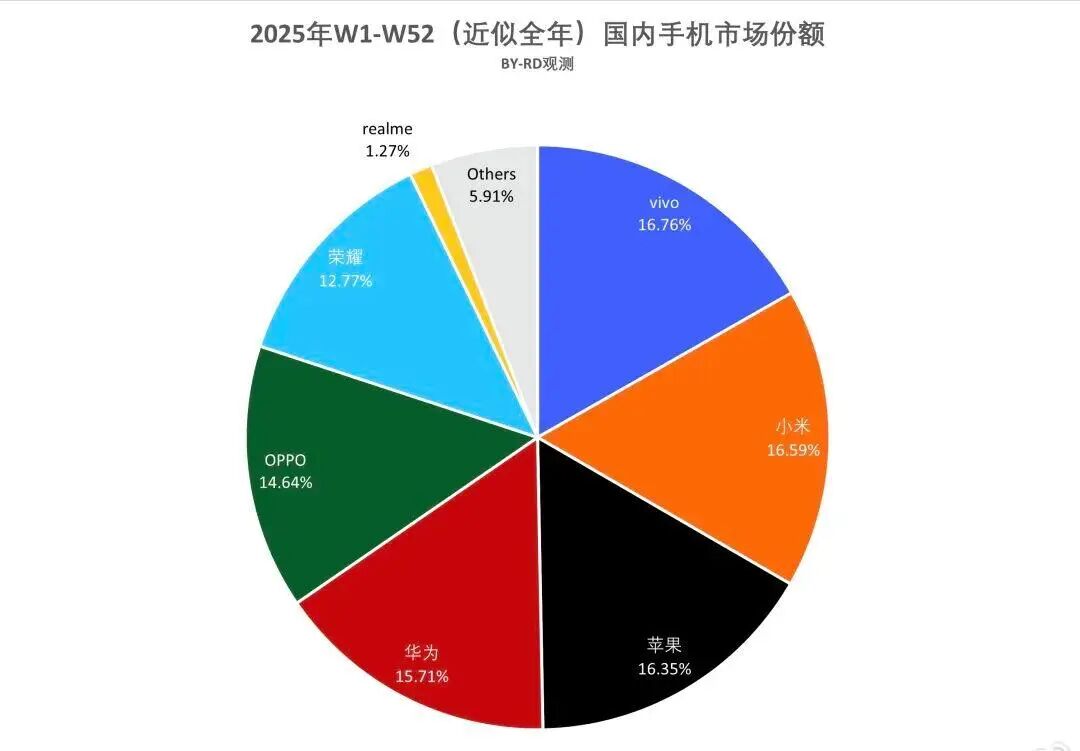 荣耀手机的市场轨迹近两年正经历剧烈波动,2025年,荣耀在中国市场的全年份额为12.77%,比2024年的14.79%下滑了约2个百分点,是当年TOP6品牌中跌幅最大的一家。