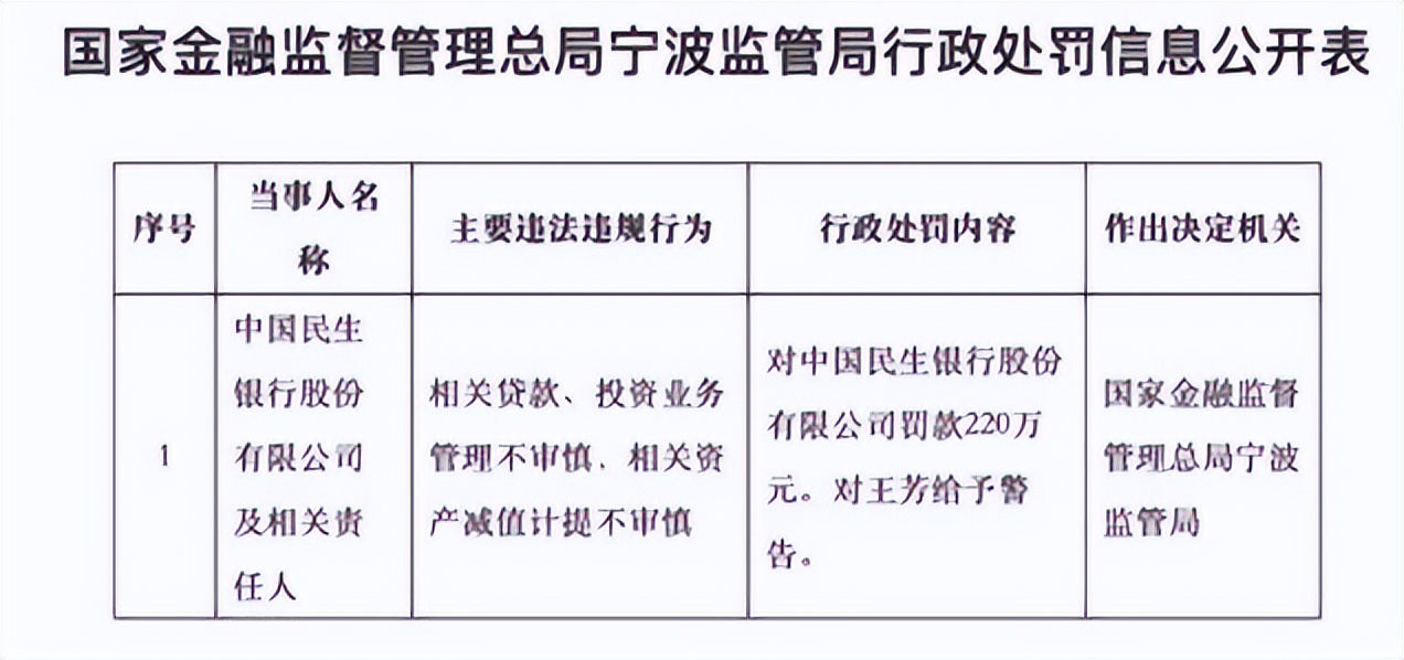 具体来看,2025年12月31日,民生银行因相关贷款、投资业务管理不审慎,相关资产减值计提不审慎等多项违法事实被国家金融监督管理总局宁波监管局罚款220万元;同时相关责任人王芳被给予警告。