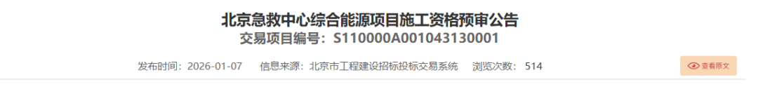 小编获悉,日前,相关网站发布了“北京急救中心综合能源项目施工资格预审公告”,公告显示合同估算为1241万元。
