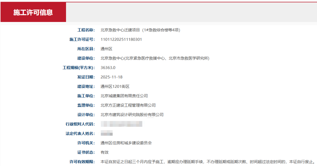 据小编了解,去年11月,市住建委发布了“北京急救中心迁建项目(1#急救综合楼等4项)施工许可信息”。