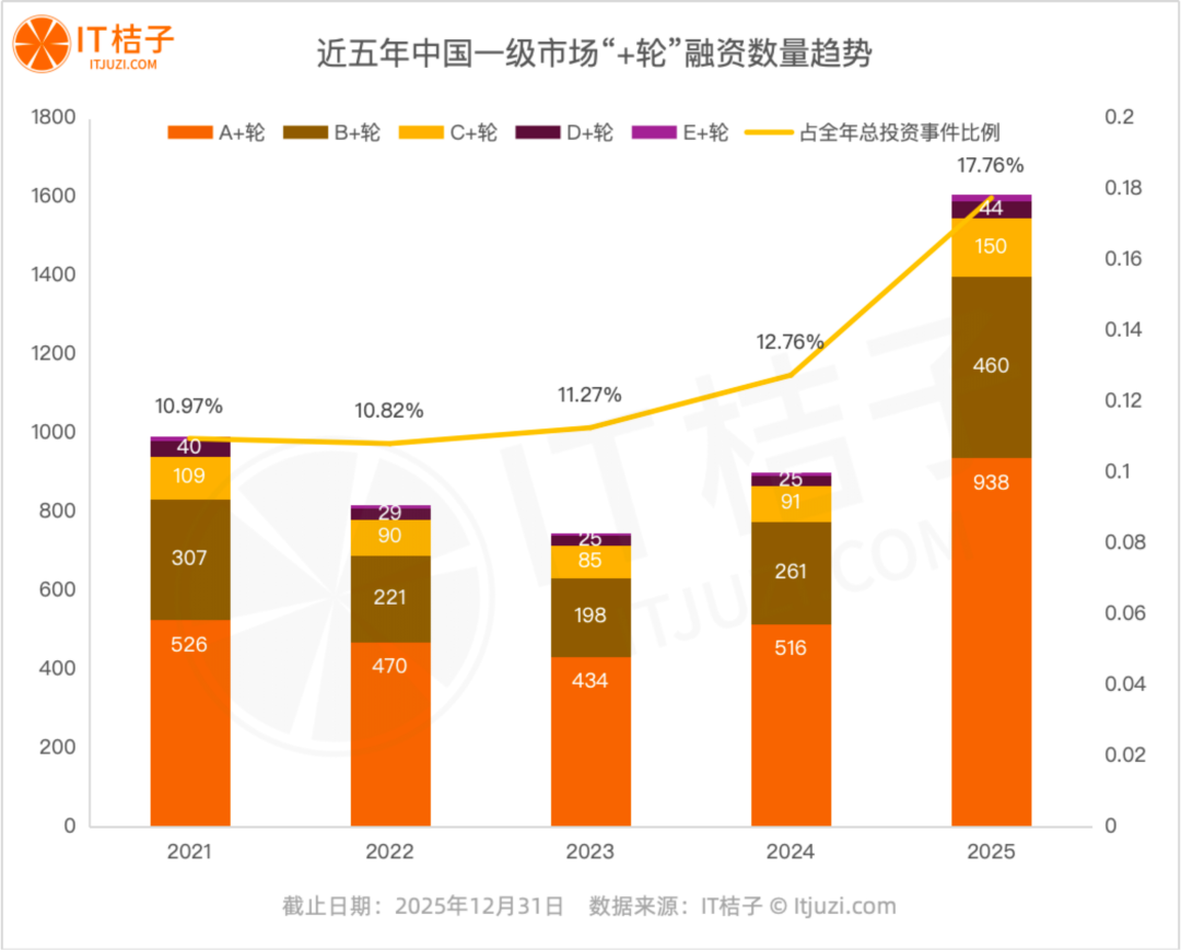 IT桔子数据显示,「+轮」融资在整个一级市场的存在感越来越强。其占全年总投资事件的比例,已从2021年的11%稳步提升至2025年的17.8%,这意味着如今平均每发生6笔投资,就有1笔是「+轮」。