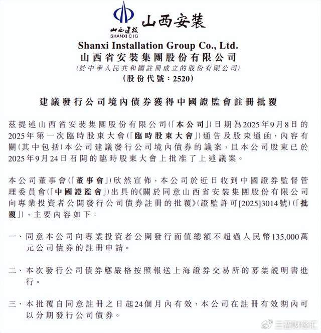 1月7日,山西港股上市公司山西安装(02520.HK)发布公告称,公司向专业投资者公开发行面值总额不超过13.5亿元人民币的境内公司债券,已正式获得中国证监会注册批复。