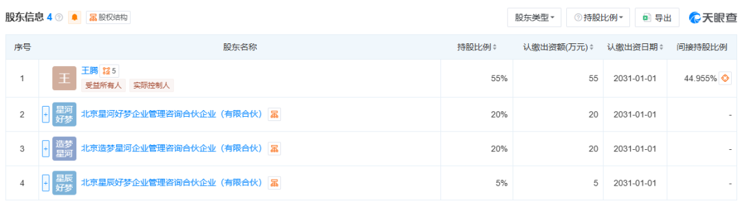 股权结构上,目前王腾直接持有今日宜休55%的股权,其余45%股权分配给合伙企业,由王腾代持,显然已预留好今后融资和股权分配的份额。