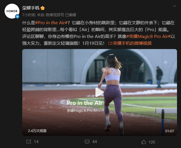 自iPhone Air发布之后,国内不少厂商规划了类似定位和形态的手机,但因iPhone Air市场遇冷以及对市场前景的不确定,只有极个别厂商最后坚持推出了类似产品,比如荣耀,1月8日宣布将在1月19日发布荣耀Magic8 Pro Air,也就是荣耀最近宣传的“既Pro又Air的手机”。