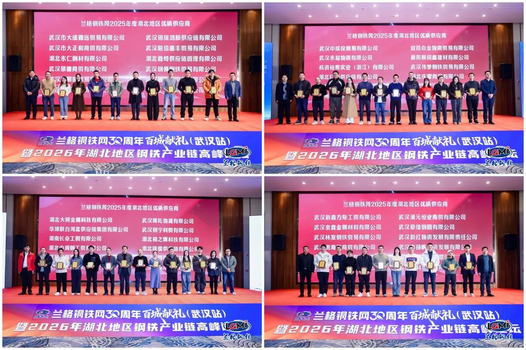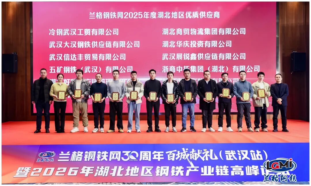会上还隆重举行了“兰格钢铁网2025-2026年度湖北地区优质供应商授奖仪式”,宝武集团鄂城钢铁有限公司营销中心党委书记李建华,中建三局云采供应链有限公司副总经理邝远亮,中铁建大桥局工程集团有限公司集团专家逯其江,武汉航科物流有限公司总经理曾小伟,武汉市金属材料流通协会执行会长朱宏志,找钢产业互联集团董事总经理黄祖贻,大冶华鑫实业有限公司销售部董德廷,中国能建华中区域联采中心、葛洲坝集团供应链公司集中采购中心万胜,武汉市黄陂钢材协会会长彭勇,山西晋城钢铁控股集团有限公司王风华等领导为获奖企业颁发奖牌。此次颁奖不仅是对区域钢铁供应链中表现卓越、口碑俱佳的供应商企业的充分肯定,更旨在树立行业标杆、激发市场活力,持续优化钢铁产业链生态,为行业高质量发展注入正向动能。