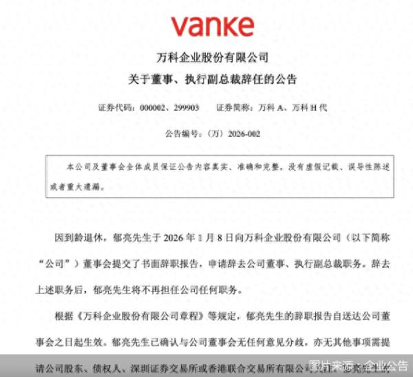 债务展期谈判桌上的博弈尚未尘埃落定,一封来自董事会的辞呈,将万科与房地产行业长达十余年的“郁亮周期”正式画上句号。1月8日,万科发布公告称,郁亮因到龄退休,向公司董事会提交书面辞职报告,申请辞去公司董事、执行副总裁职务,并不再担任公司任何职务。伴随着郁亮的退休,万科正式进入全深铁周期,而他曾经掌舵的这家企业也正处在一场艰难的“生存之战”中。近期万科密集召开债券持有人会议,审议多笔债券展期。公告强调,郁亮辞任不会影响公司董事会正常运作和经营。