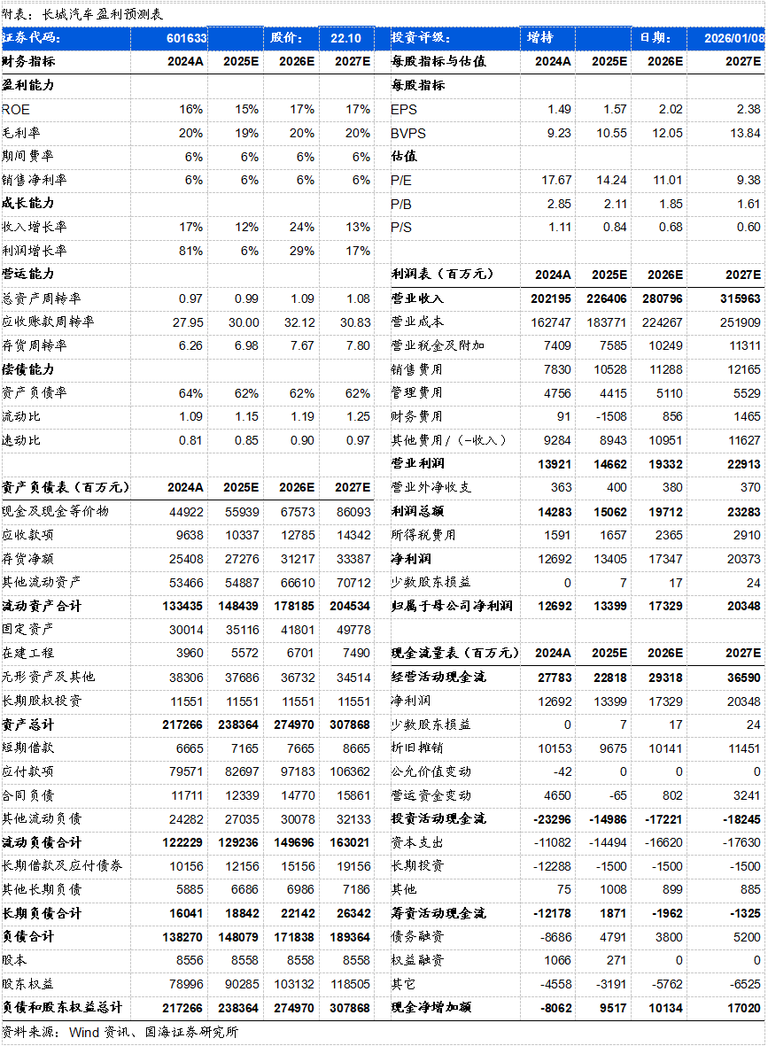 公司海外竞争优势稳固,盈利确定性较高,随未来产品推出,公司销量整体趋势向上,预计公司2025-2027年实现营业收入2264、2808、3160亿元,同比增速为12%、24%、13%;实现归母净利润134.0、173.3、203.5亿元,同比增速为6%、29%、17%;EPS 为1.57、2.02、2.38元,对应当前股价的PE估值分别为14.2、11.0、9.4倍。我们预计公司未来收入等业绩指标持续向好,看好公司未来发展,维持“增持”评级。