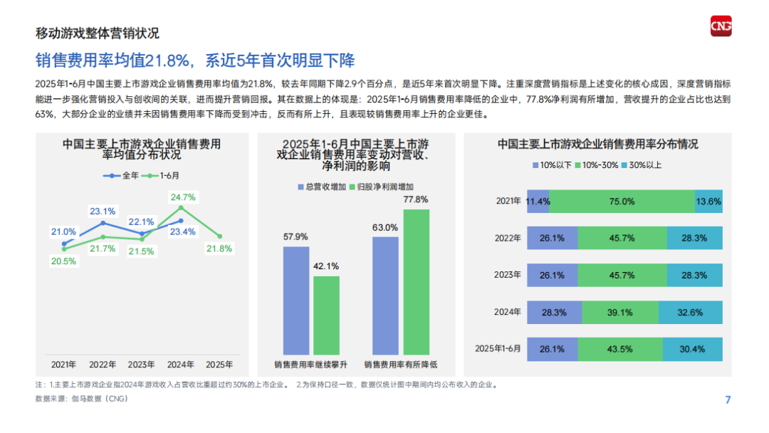 游戏工委《2025中国移动游戏广告营销报告》提到,2025年上半年中国主要上市游戏企业销售费用率均值为21.8%,较去年同期下降2.9个百分点,是近5年来首次明显下降——厂商压缩营销费用,业绩却变得更好。背后逻辑在于,增长来自旗舰级产品、来自长青大作。