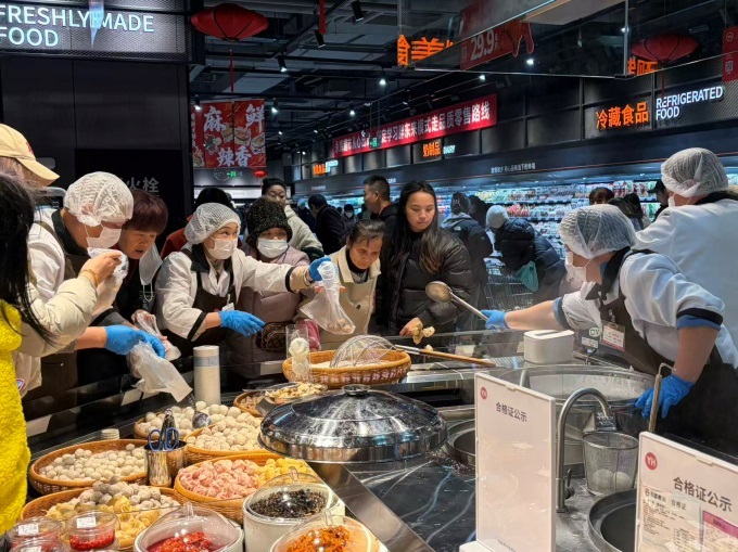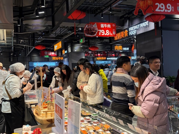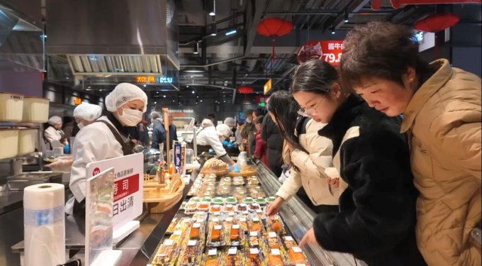 最能直接点燃味蕾的,莫过于香气四溢的熟食烘焙区。熟食档口汇聚天南地北风味,现制披萨、捞汁小海鲜、去骨猪蹄、轻食沙拉应有尽有;福州鱼丸、皮皮虾、梭子蟹、椒盐蹄膀等硬菜选择丰富;更有糖炒板栗、快乐薯、烧烤烤串、小笼包等小吃,满足消费者对便捷美食与地方风味的双重期待。