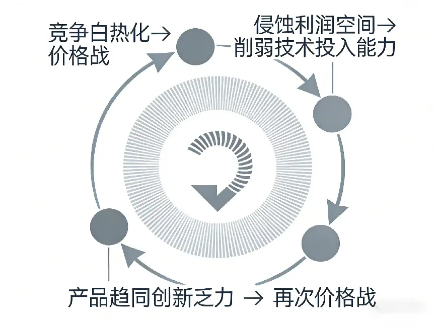 这就陷入了“车企因竞争白热化而发动价格战-价格战侵蚀全产业链利润-上下游技术投入与价值创造能力被削弱-产品趋同、创新乏力-为争夺市场,不得不再次祭出更猛烈的价格战”的死循环。