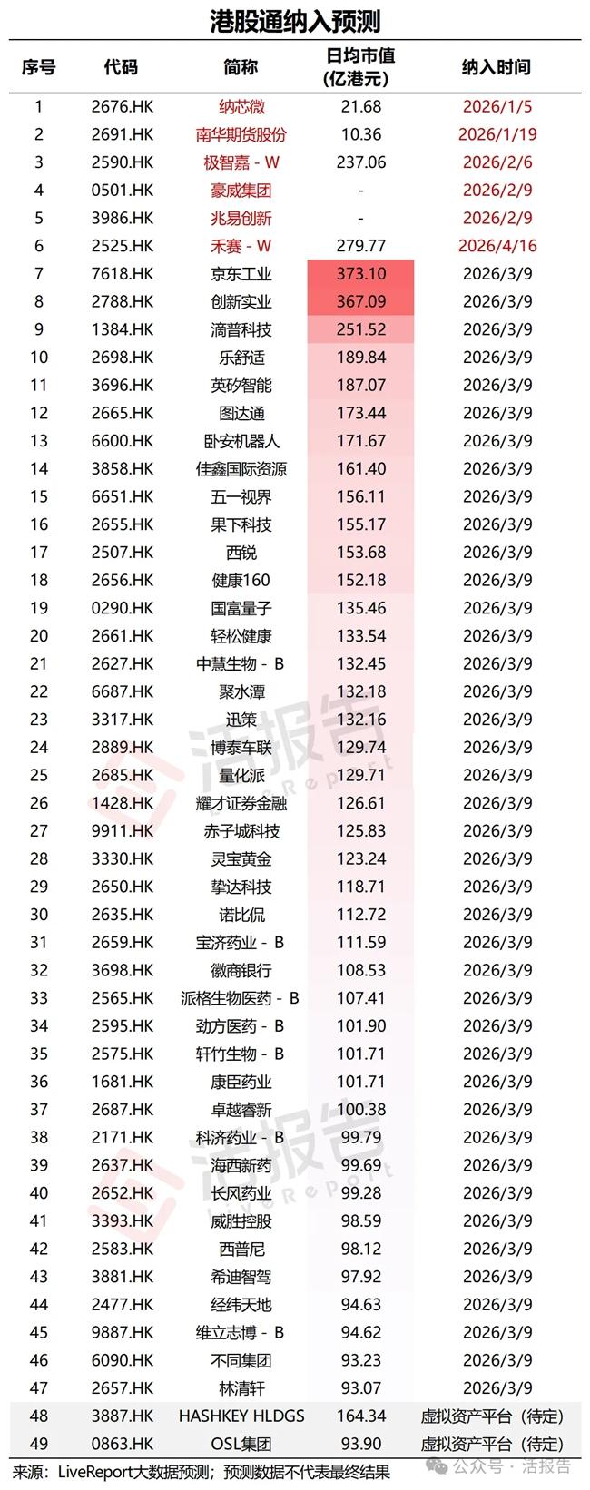 根据LiveReport,本次有望纳入的公司有:京东工业、创新实业、滴普科技、乐舒适、英矽智能、赤子城科技、图达通、卧安机器人、佳鑫国际资源、五一视界、国富量子、果下科技、西锐、健康160、轻松健康、中慧生物-B、聚水潭、迅策、博泰车联、量化派、耀才证券金融、灵宝黄金、挚达科技、派格生物医药-B、劲方医药-B、诺比侃、宝济药业-B、徽商银行、轩竹生物-B、长风药业、康臣药业、卓越睿新、科济药业-B、海西新药、维立志博-B、威胜控股、西普尼、希迪智驾、经纬天地、不同集团、林清轩等41只股票有望于2026年3月9日的定期检讨中纳入港股通。HASHKEYHLDGS、OSL集团等2家虚拟资产交易平台能否纳入港股通有待观察。