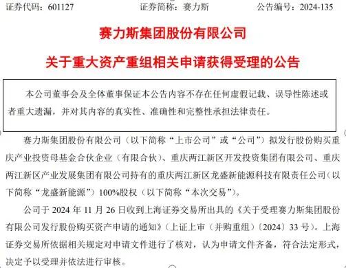 2024年11月27日,赛力斯发布公告,宣布斥资81.64亿元,全面收购重庆两江新区龙盛新能源科技有限责任公司100%的股权,实现对重庆“超级工厂”的完全掌控。