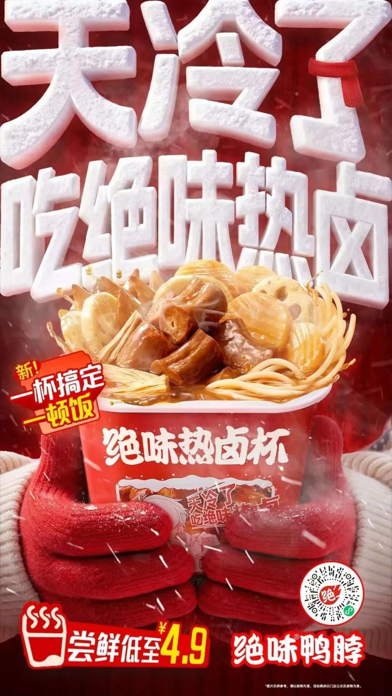 在卤味行业变革浪潮中,热卤以现制新鲜、热食体验为卖点,契合年轻消费者追求品质和体验的需求。与传统冷卤相比,热卤更能满足消费者对即时美味的需求,市场潜力巨大。绝味敏锐捕捉到这一市场动态,在11月,创新推出全新热卤杯系列产品,为消费者带来与众不同的味觉与体感温暖体验。