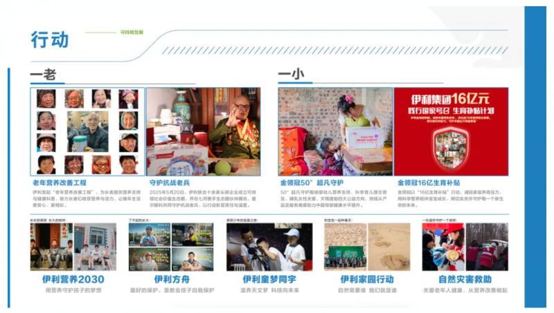 与绿色发展并行的还有伊利的公益脚步。潘刚曾表示:“厚度优于速度,行业繁荣胜于个体辉煌,社会价值大于商业财富”。秉持潘刚的社会责任理念,伊利长期投入公益事业,打造涵盖伊利方舟、伊利营养2030、老年营养改善工程等多个长线公益项目,构建了“一老一小”健康守护公益新格局。其中,“老年营养改善工程”项目深入社区、养老院、军休所、荣军院、老年大学、长者食堂等,常态化开展营养健康科普宣教活动,助力老年人营养膳食改善,目前受益老年人已超4万名。