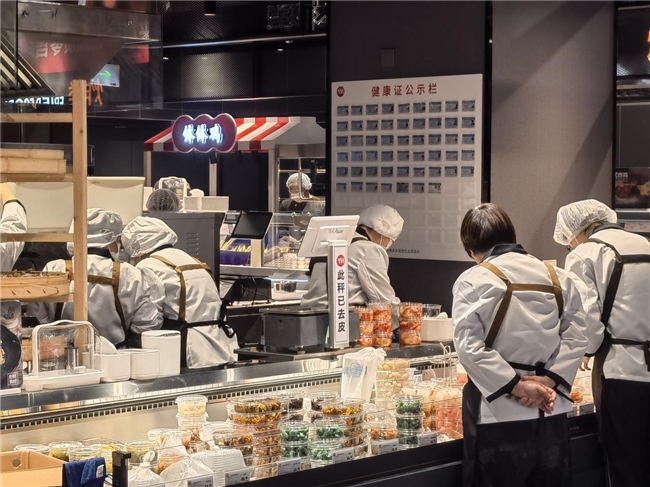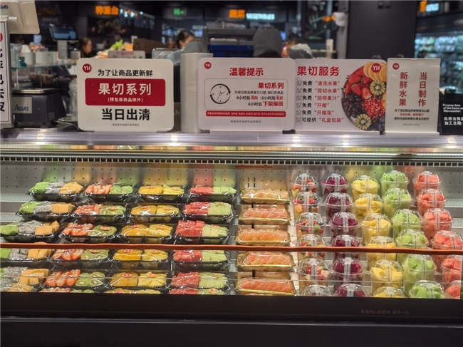 在服务细节上,将温度渗透于每个触点。全新升级的顾客服务区,可提供多项便民设施。各品类深度服务全面上线:肉禽柜台支持免费切配加工;海鲜柜台提供清洗、处理服务;水果区引入更细致的品质标识与食用建议。食品安全管控也严格执行以“新鲜”为核心的标准,果切推行“468原则”(4小时8折、6小时6折、8小时下架),部分叶菜、肉禽、水产严格执行“日清”,不售隔夜商品。