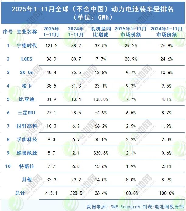 中国公司方面,2025年1-11月,宁德时代、比亚迪、国轩高科、孚能科技、蜂巢能源这5家公司在海外动力电池市场的装车量总计181.1GWh,市场份额为43.7%。