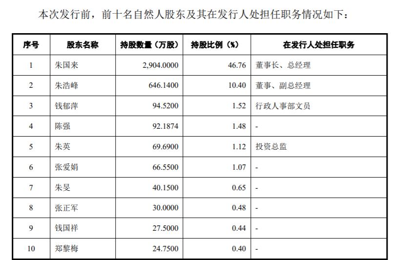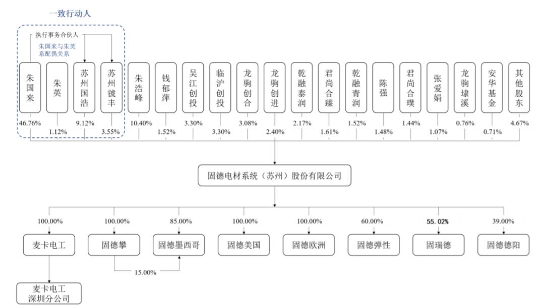 此外,固德电材副总经理朱浩峰持股10.40%,投资总监朱英持股1.12%,朱旻持股0.65%未任职,行政人事部文员钱郁萍持股1.52%。朱英系朱国来配偶,朱旻系朱英兄长,钱郁萍系朱浩峰配偶。