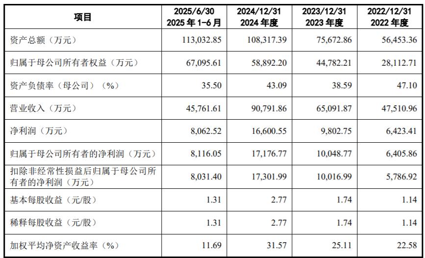 业绩方面,2022年至2024年及2025年上半年,公司实现营业收入4.75亿元、6.51亿元、9.08亿元和4.58亿元;归属于母公司所有者的净利润分别为0.64亿元、1.00亿元、1.72亿元和0.81亿元。