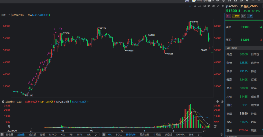 国泰君安期货预测,在“以需定销”的思路下,2026年多晶硅环节全年供需大概率实现去库存。考虑到平台成立后的运营成本,他们预计多晶硅期货全年运行区间可能在每吨5万至8万元。