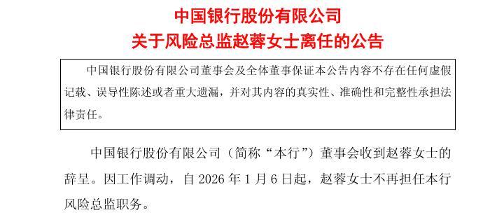 2026年1月6日,中国银行发布公告称,因工作调动,赵蓉自当日起不再担任该行风险总监职务。