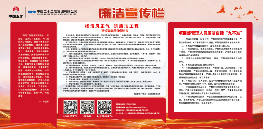 在中国五矿集团有限公司党组和中国中冶党委的坚强领导下,中国二十二冶集团有限公司(以下简称“中国二十二冶”)以高度政治自觉与行动自觉,率先谋划、系统推进“两个示范”(廉洁示范项目、廉洁示范岗)创建,贯彻落实“清廉项目示范工程建设”的各项部署要求,将廉洁建设深度融入项目管理全过程,为企业高质量发展注入了强劲的“廉动力”。