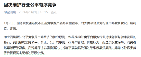 淘宝闪购欢迎并将积极配合此次行业市场竞争状况调查、评估工作,严格落实合规主体责任,持续与商户、生态合作伙伴等各方携手,提供更多元化、更高质量的服务,共同维护好公平有序的市场环境,合力推动外卖服务行业进一步繁荣发展。