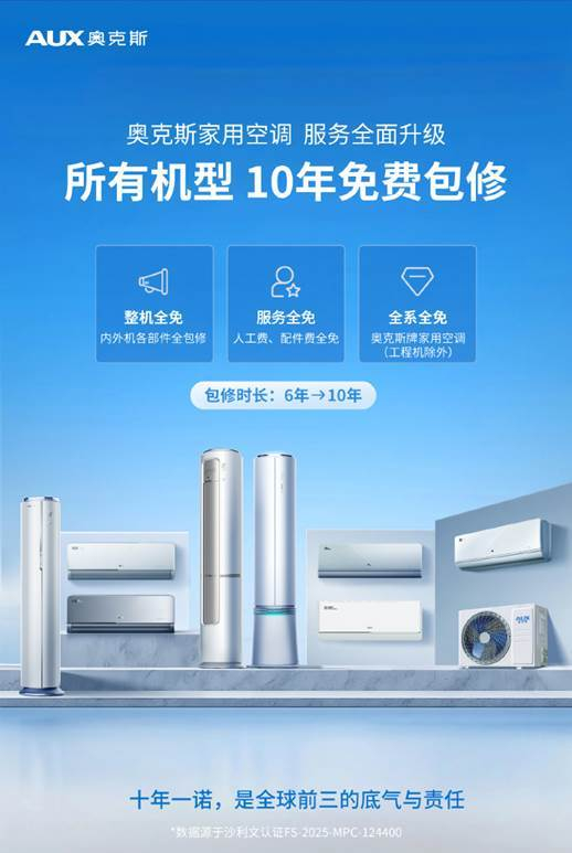 奥克斯空调以“用户至上”为核心,完成了服务承诺的阶梯式升级。2025 年 9 月,品牌率先对指定机型推出“10 年整机免费包修”政策,随后于 12 月加码升级,宣布自 2026 年 1 月 1 日起,在全国范围内将该服务覆盖至家用全系列空调产品。