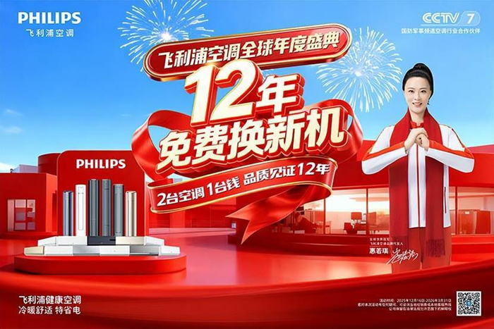 飞利浦空调推出“12 年免费换新机”活动。同时,家用空调享“六免服务”“价保全年,“极速送装”等权益,将服务流程从被动维修推向了主动、无忧的更高维度。