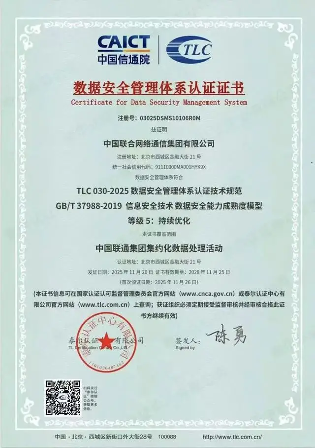 而中国联通能够拿到数据安全管理体系最高的第5级认证,相当于全国考试拿了满分,而且是国内首个,也是目前唯一一个,这就很厉害了!这张由中国信通院和泰尔认证中心联合发布的认证,等于是国家该领域最高权威机构的背书,含金量非常高。