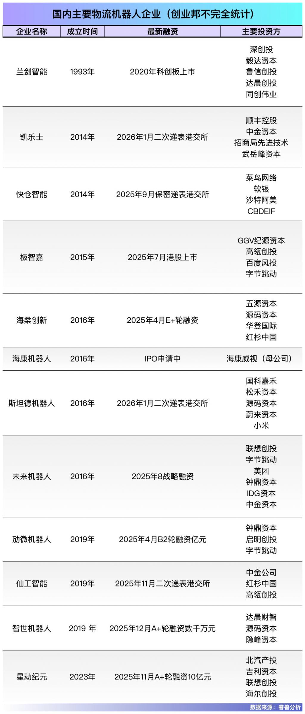 在凯乐士之前,极智嘉已于 2025 年 7 月港股上市,是全球 AMR 仓储机器人第一股。斯坦德机器人也于 2026 年 1 月 4 日二次递表港交所,快仓智能则在 2025 年 9 月以保密形式递表,两家企业均计划 2026 年冲击港股上市。