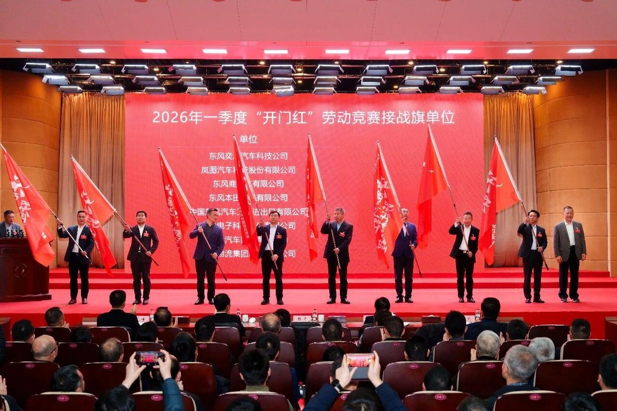 会上,东风汽车集团有限公司“攻坚325,决胜开局年”2026年全员主题劳动竞赛正式启动。本次竞赛将贯穿全年,并同步启动一季度“决胜开门红跃迁赢新程”专项竞赛。公司董事长、党委书记杨青为一季度劳动竞赛接战旗单位授旗,标志着公司全面吹响“十五五”开局攻坚冲锋号,动员全体干部职工以决战决胜姿态筑牢开局根基。