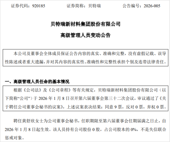 同时,贝特瑞聘任黄舒欣女士为公司董事会秘书,任职期限至第六届董事会任期届满之日止,自2026年1月8日起生效。