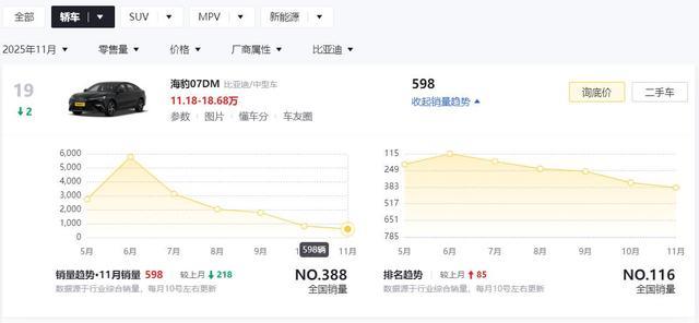 最后,目前在售的海豹07仅提供DM-i车型,售价区间为13.98-19.58万,在刚过去的11月份,其更是仅售出了598辆新车,由此可见,整个海豹07车系也急需新车型的加入来提振自身销量。