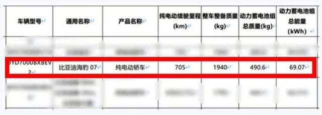 比亚迪海豹07EV前阵子公布了工信部申报图信息,作为现款海豹07 DM-i的纯电版本,新车将会搭载69.07千瓦时的电池包,而官标的纯电续航里程则为705km。
