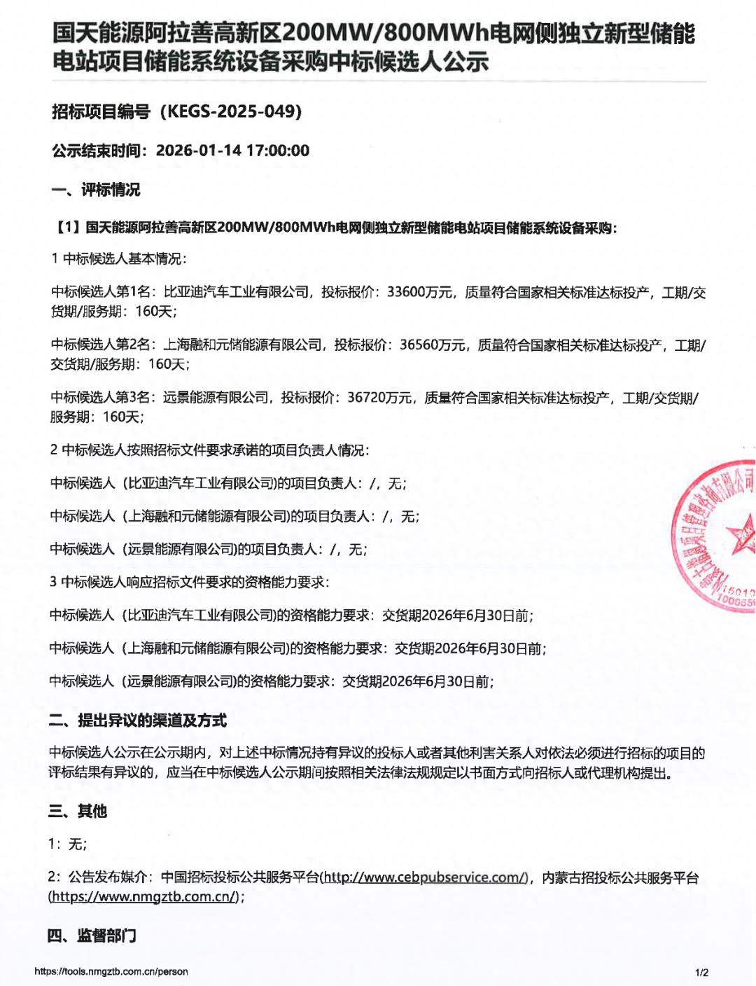 0.42元/Wh,比亚迪预中标内蒙古200MW/800MWh储能系统采购