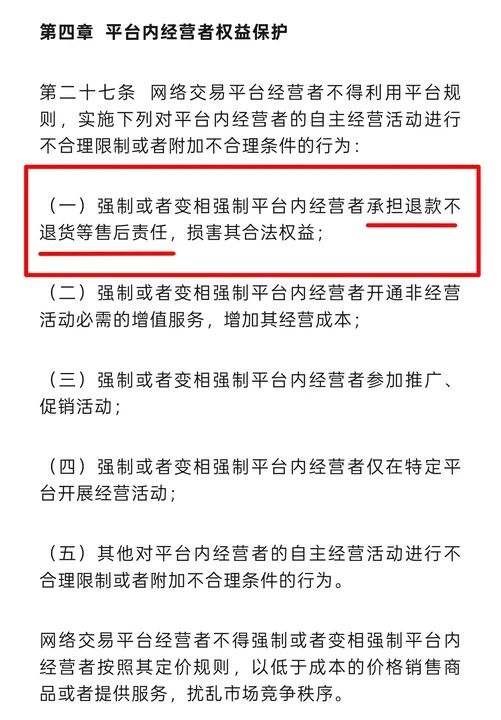 其中,《办法》对商家的权益保护做了进一步规范:不得强制或者变相强制平台内经营者承担退款不退货等售后责任,损害其合法权益。
