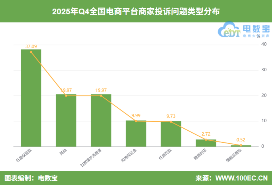 “电诉宝”显示,在2025年三季度、四季度全国电商平台商家投诉的问题中,任意仅退款占比分别为35.85%、37.09%,相较于2025年一季度任意仅退款投诉50.36%的占比,已经大幅改善。